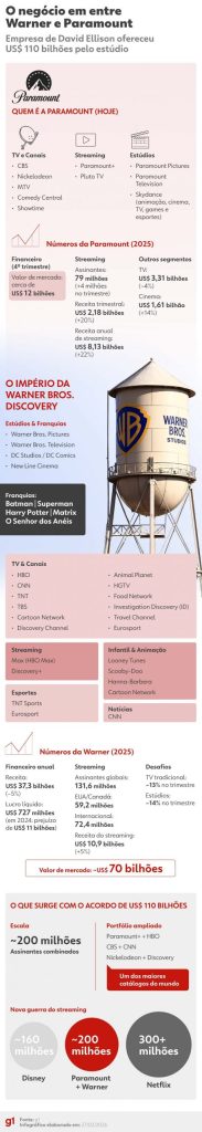 Com a incorporação dos ativos da Warner, a Paramount também ampliaria sua base de assinantes e fortaleceria sua presença em cinema, TV e plataformas digitais.