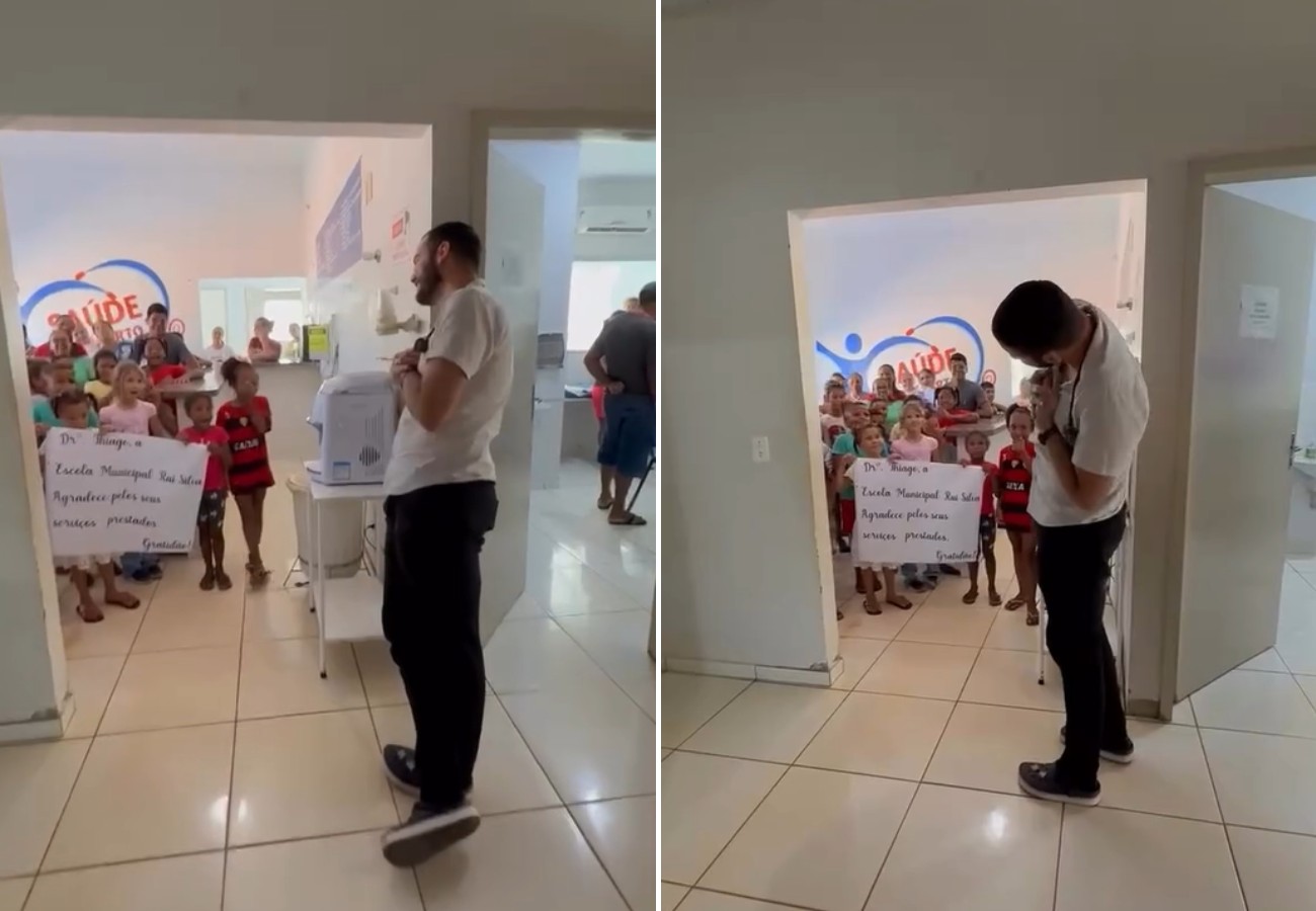 A homenagem aconteceu após o médico anunciar a saída dele da unidade de saúde do povoado. No vídeo, as crianças cantaram para o profissional que assistiu emocionado.