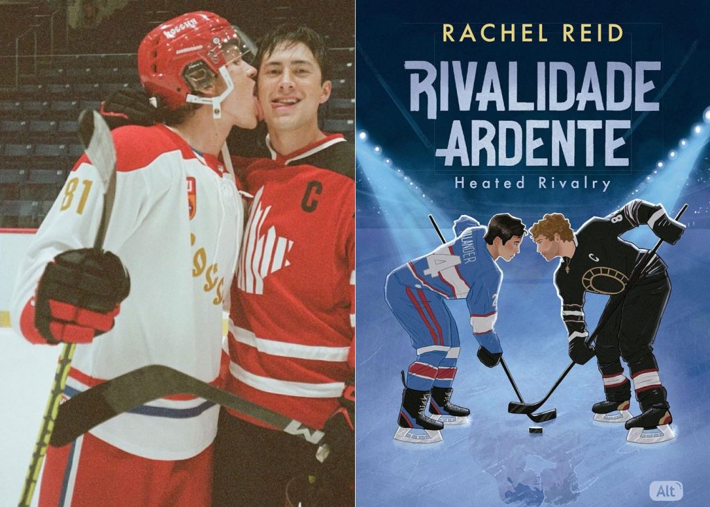 Hudson Williams e Connor Storrie nos bastidores da série ‘Heated Rivalry’; e a capa do livro ‘Rivalidade Ardente’