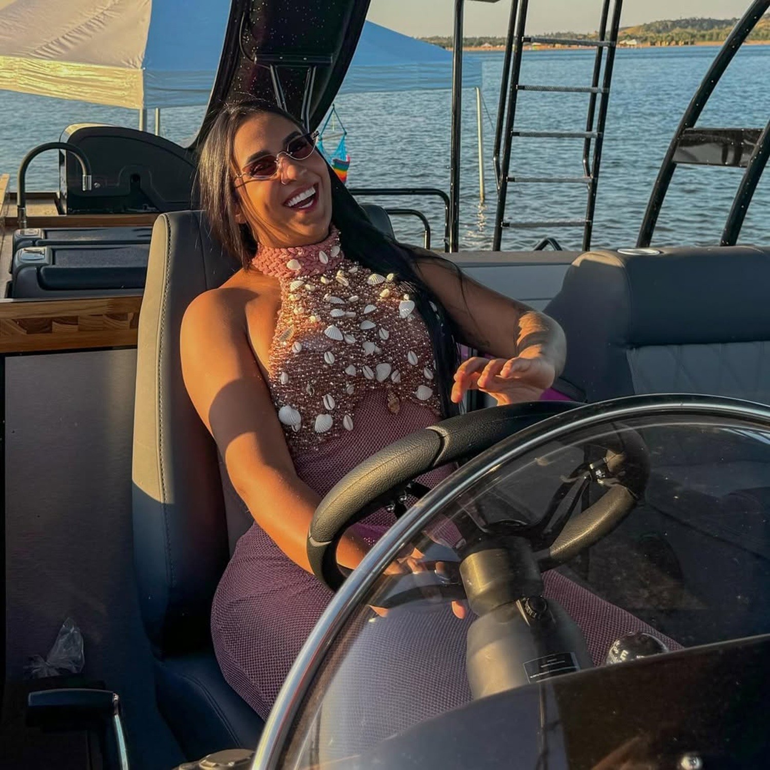 Influencer Karol Digital durante passeio de lancha