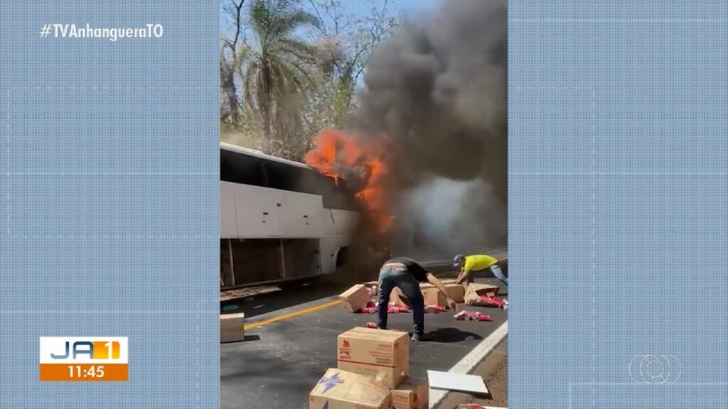 Passageiros tiram caixas de ônibus em chamas na BR-153, em Paraíso do Tocantins