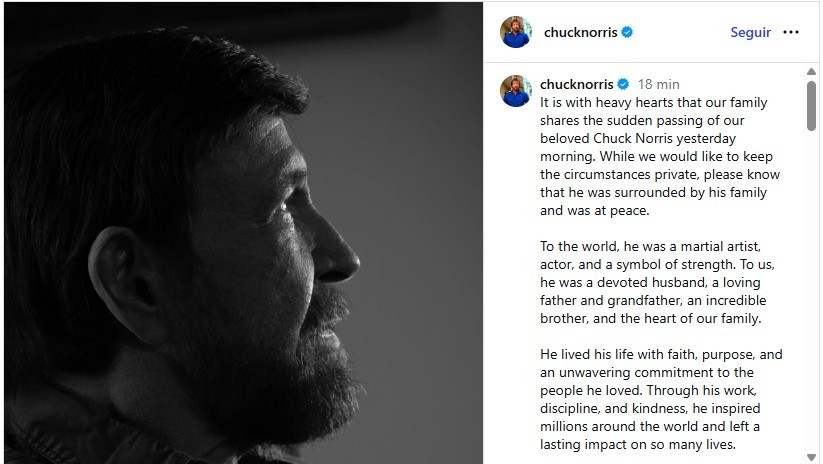 O ator e artista marcial Chuck Norris morreu aos 86 anos. A informação foi confirmada nesta sexta-feira (20), pela família nas redes sociai do ator.